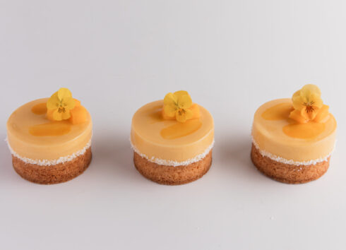 サクサクのバターサブレにオレンジ香るブリュレを重ね濃厚なレアチーズムースで包みこみました。 可愛らしい表情の小さなサンタの一品です。
